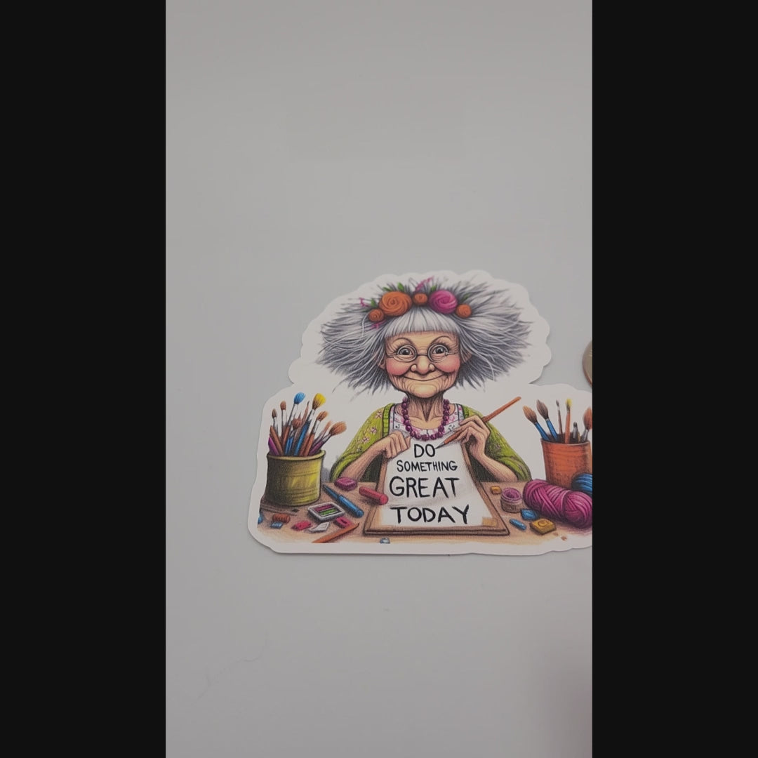 A cheerful little reminder from a woman who looks like she’s been crafting since before the internet existed. This 3x3 die‑cut sticker features an older craft lady holding a sign that says, “Do something great today.” It’s playful, colorful, and full of personality — perfect for laptops, planners, water bottles, craft carts, or happy mail.