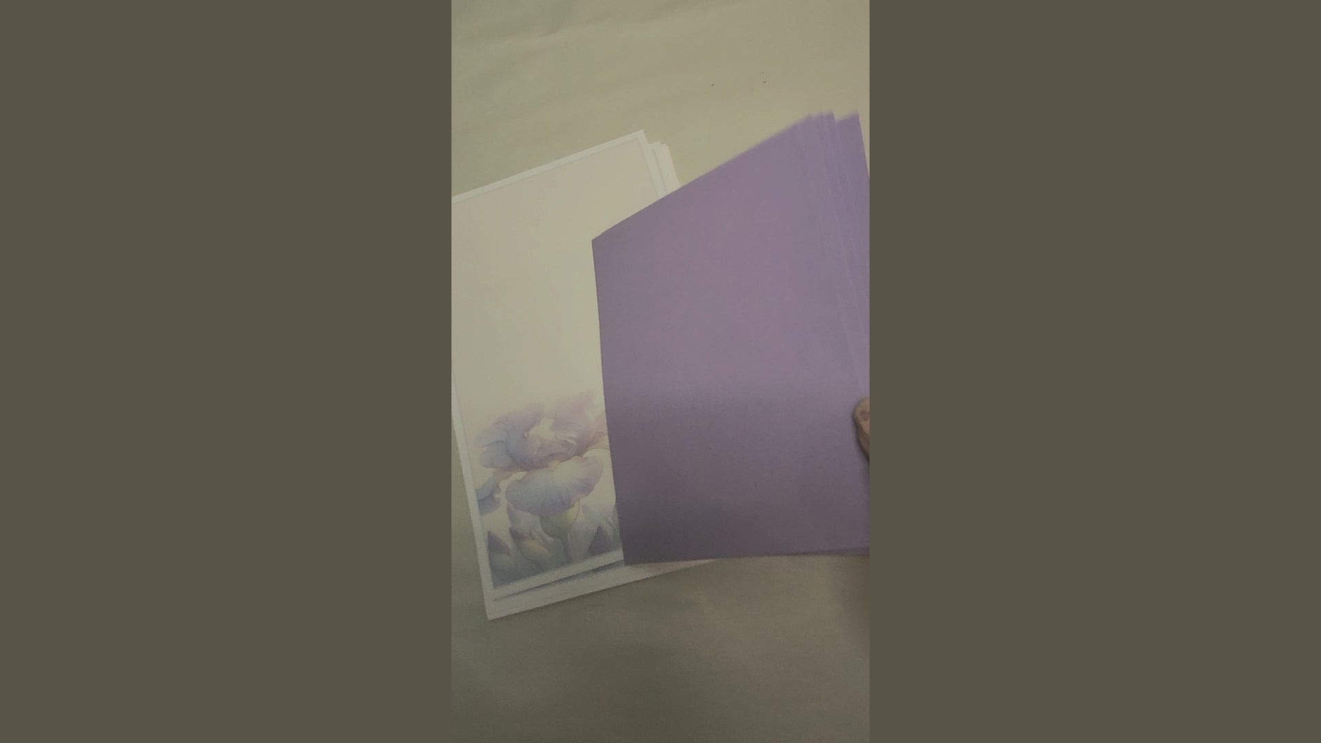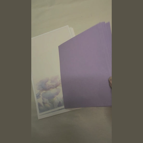 A soft, peach‑tinted writing set featuring a gentle iris at the bottom of each page, designed for slow, thoughtful letter writing. Each sheet is printed on the front with a clean white border and a full peach reverse, giving the set a warm, coordinated look. Matching purple envelopes and shiny vinyl iris stickers complete the bundle, making it a lovely gift for pen‑pals, note writers, and anyone who still enjoys sending real mail. Wrapped with an elastic cord and tucked into a protective envelope, it’s ready for gifting or keeping on your desk for everyday correspondence.